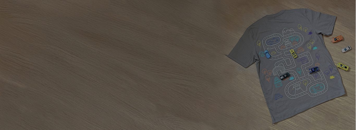 Para a frente da blusa, escolhi a arte de um carrinho e, para a parte de trás, a arte de uma pista de corrida — assim, você pode interagir e brincar com o carrinho por cima da estampa.